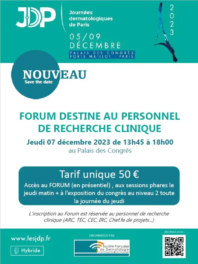 You are a clinical research staff and you take care of patients with skin diseases. We invite you to participate to the forum dedicated to clinical research staff during the Journées Dermatologiques de Paris on December 7th 2023 in Paris.
