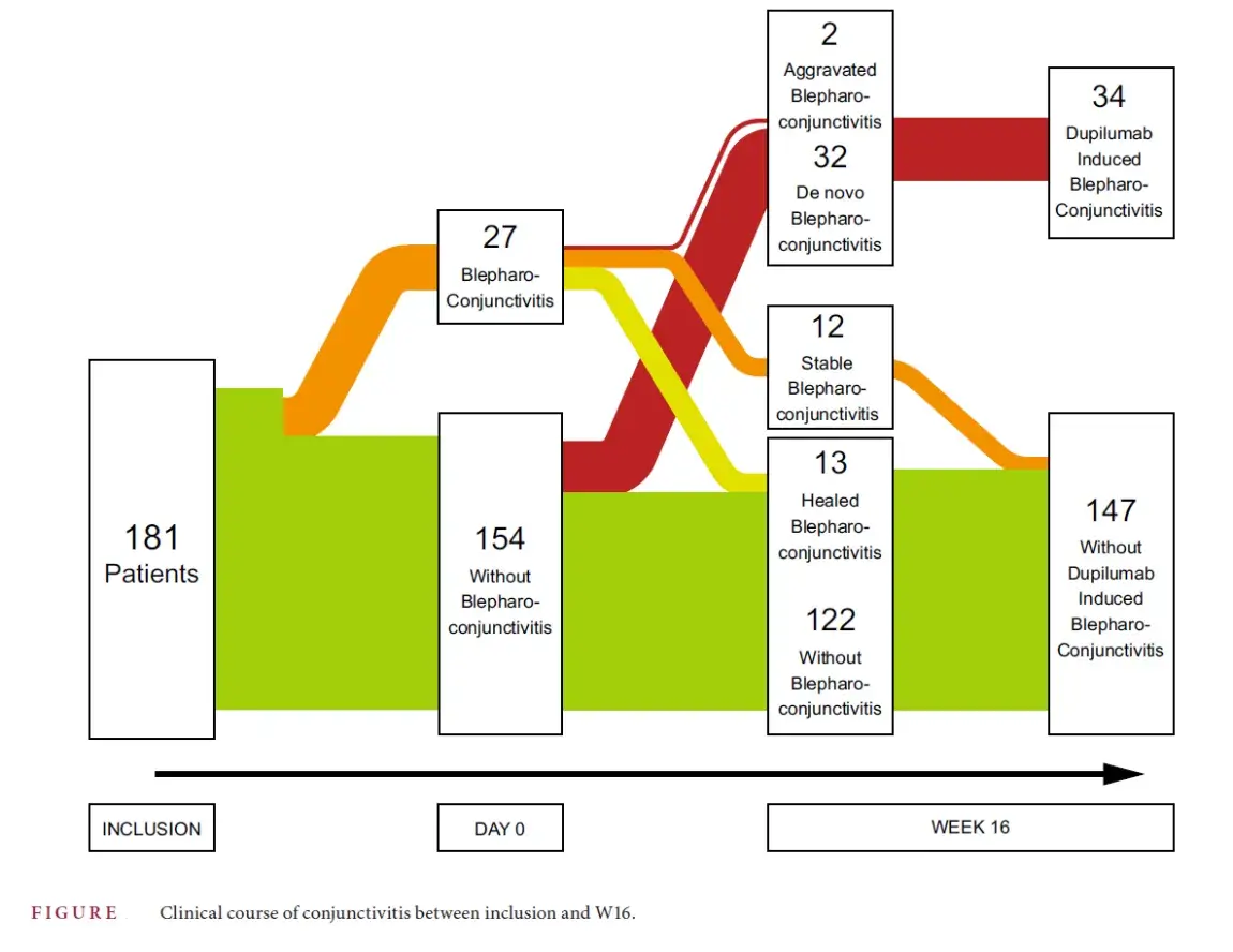 34 out of 181 patients had dupilumab-induced blepharoconjunctivitis (inflammation of the eyelid): either of spontaneous onset (n = 32) or worsening of underlying blepharoconjunctivitis (n = 2), figure below.
