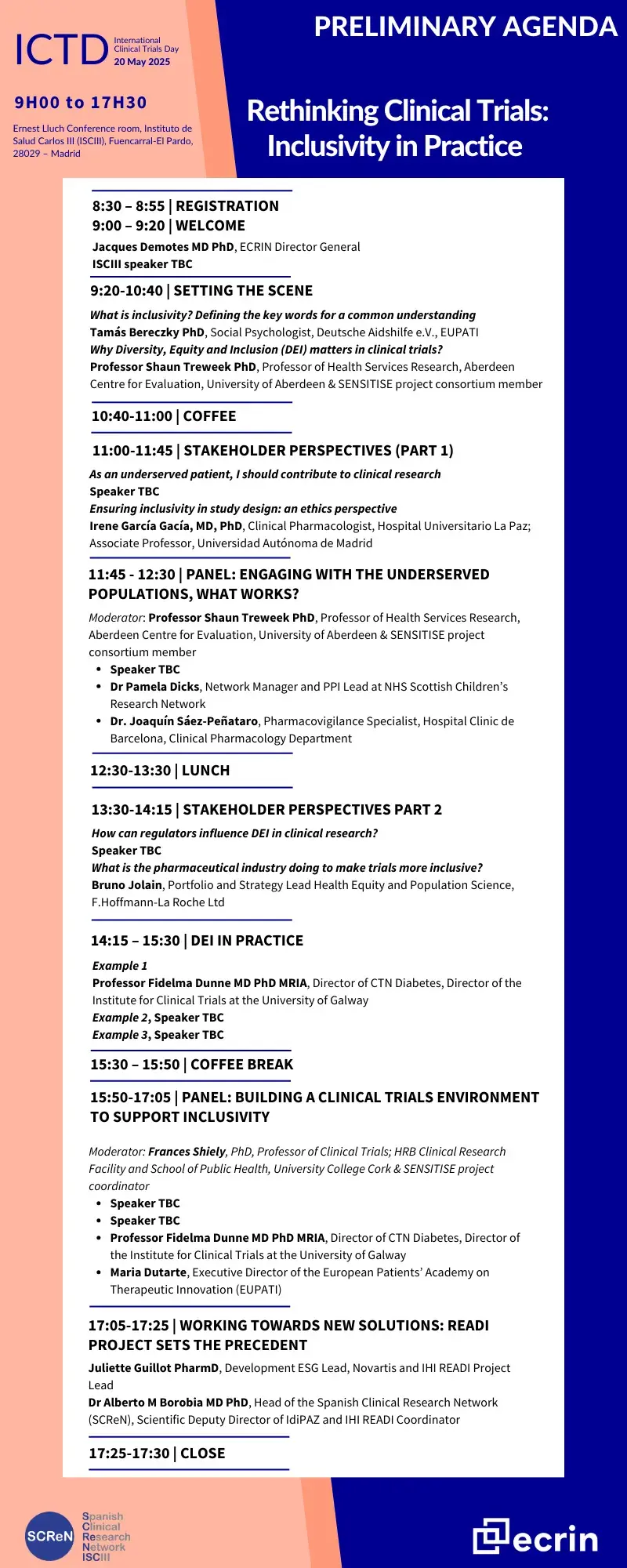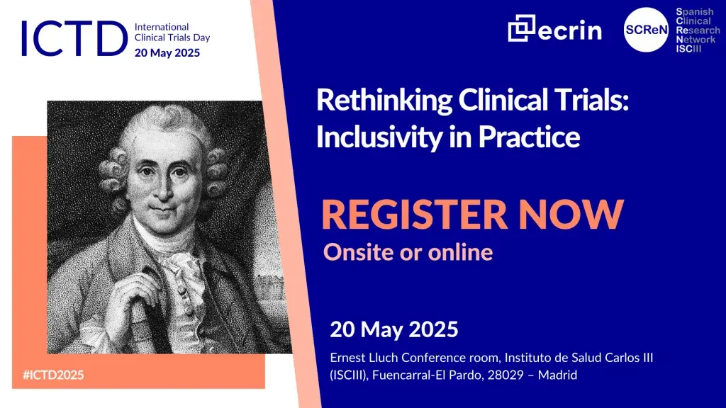 La Journée internationale des essais cliniques (ICTD) 2025, organisée par notre partenaire ECRIN en collaboration avec SCReN, se tiendra à Madrid le mardi 20 mai 2025. Le thème à l'honneur : "Repenser les essais cliniques avec une approche inclusive". Les inscriptions sont ouvertes !